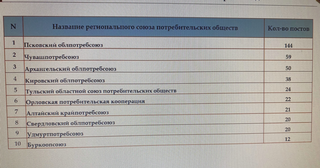 Тульский облпотребсоюз очередной раз вошел в ТОП-10 и занял 5-е место, разместив 24 публикации.